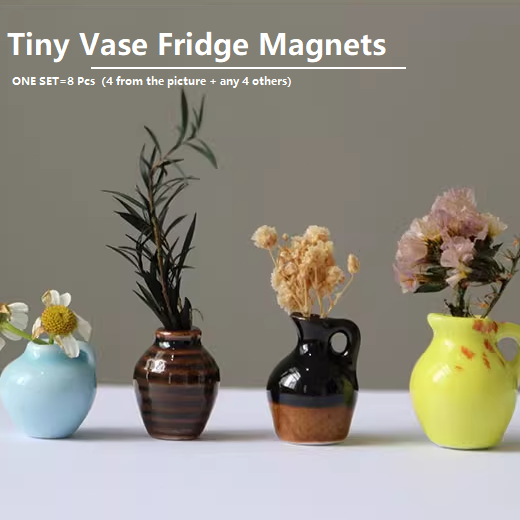 These vase-shaped fridge magnets feature a Nordic & Chinese fusion style. Made from resin with a ceramic-like finish, they come in chocolate glaze/cream. Each set includes 8 pieces, with 4 from the picture and any 4 others. Perfect for kitchen, office, or gifts. Kid-safe and shatterproof.